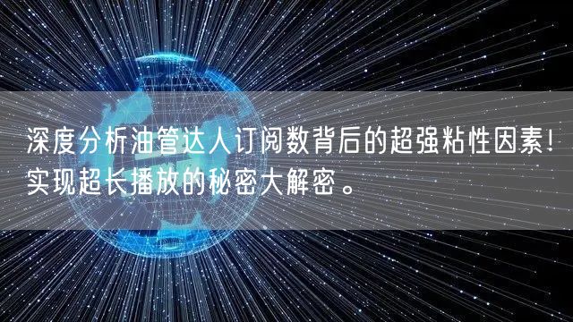 摘要:本文将深度剖析油管达人订阅数背后的超强粘性因素,通过探究其成功背后的秘密,揭示实现超长播放的秘密,为关注油管达人的发展者提供有价值的参考。